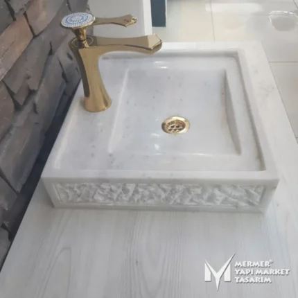 Beyaz Mermer Kenarları Kıvrımlı Kare Lavabo
