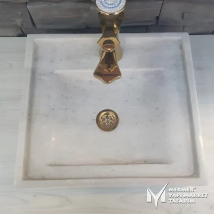 Beyaz Mermer Rustik Kare Lavabo – Batarya Çıkışlı